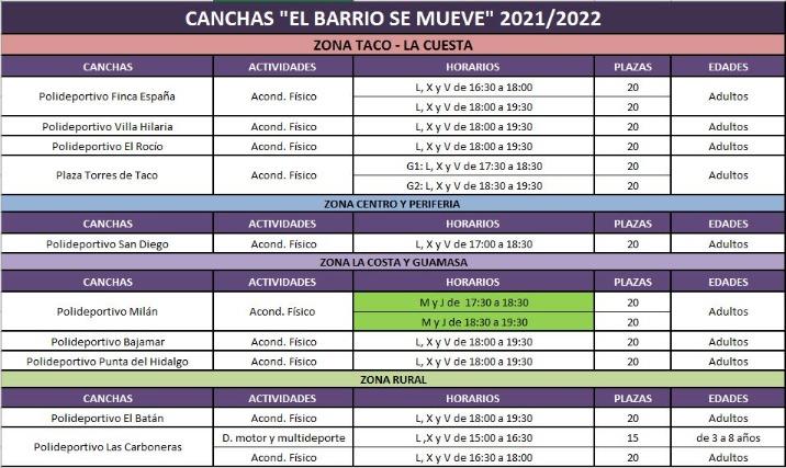 Desde el pasado 4 de octubre, en el marco del programa La Laguna DeporVida, se está llevando a cabo la actividad ‘El barrio se Mueve’ en diez canchas del municipio lagunero. Impulsado por el Organismo Autónomo de Deportes (OAD) del Ayuntamiento de La Laguna, presidido por Idaira Afonso, la práctica deportiva que se incluye en esta parte del programa son el acondicionamiento físico y actividades multideporte, las cuales van dirigida a adultos.