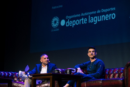 El comentarista, analista de fútbol y entrenador Álvaro Benito Villar fue el gran protagonista de un delicioso diálogo sobre deporte, salud mental y otros asuntos de actualidad en un repleto Teatro Leal, que agotó las invitaciones para el primer evento Isla de Fútbol, organizado con la colaboración del Ayuntamiento de La Laguna y el patrocinio del Organismo Autónomo de Deportes lagunero.